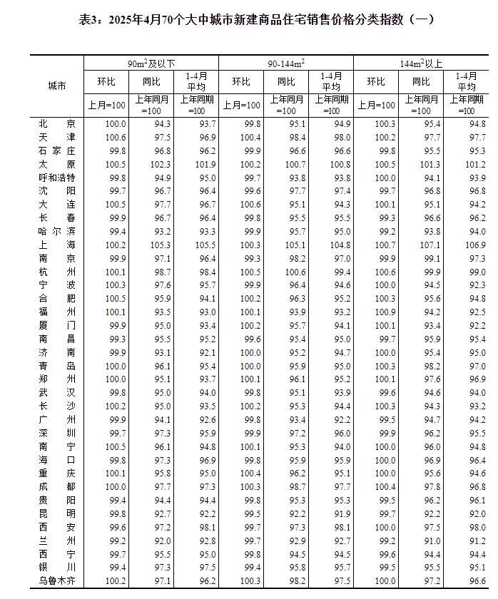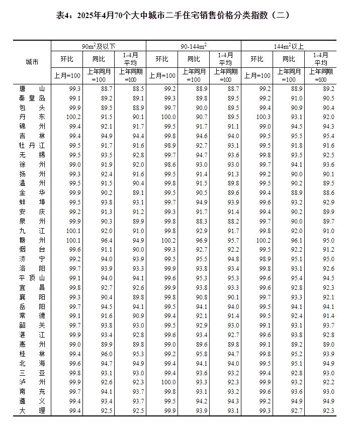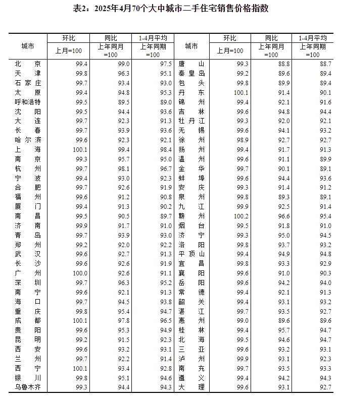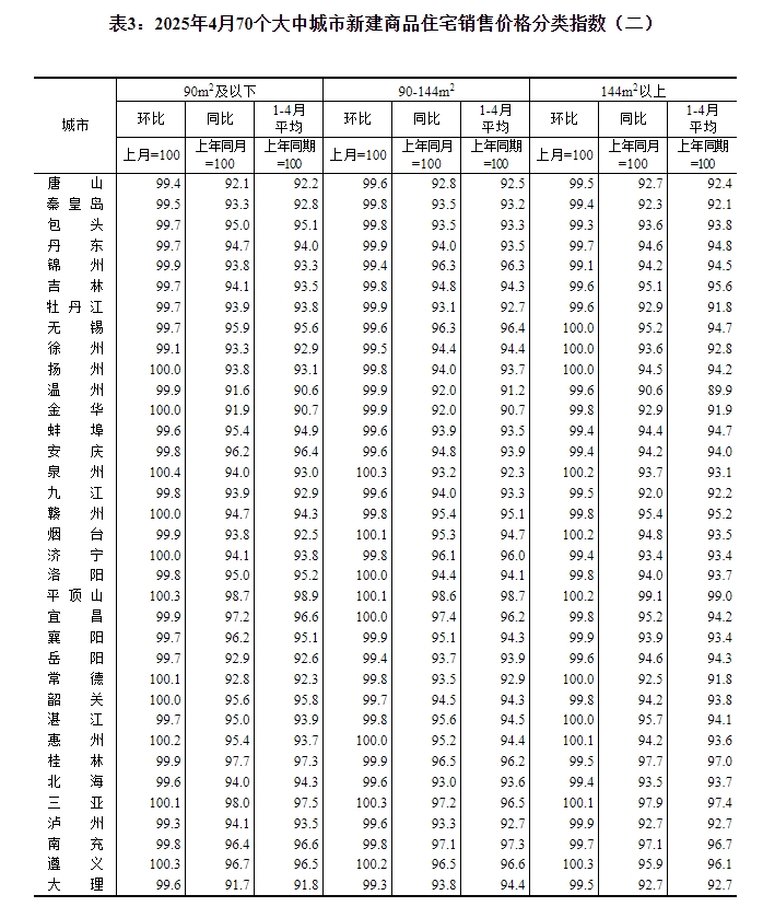 2025年4月份,70个大中城市中,各线城市商品住宅销售价格环比持平或略降,同比降幅均持续收窄。