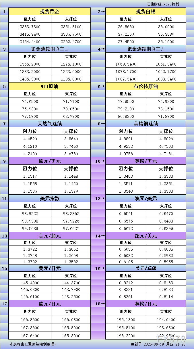 XM官网官网一张图看商品支撑阻力:金银油气+铂钯铜农产品期货(2025年6月20